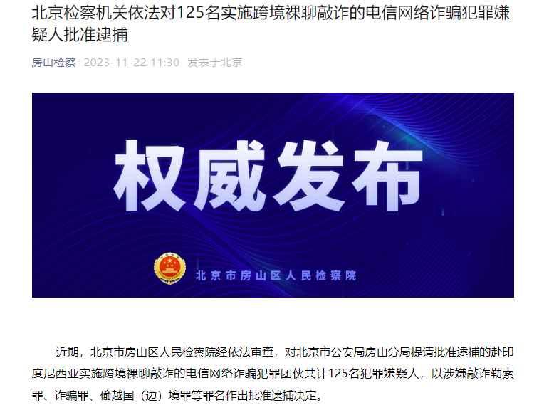 香港新聞網11月22日電 據“房山檢察”微信公眾號22日消息,近期,北京市房山區人民檢察院經依法審查,對北京市公安局房山分局提請批準逮捕的赴印度尼西亞實施跨境裸聊敲詐的電信網絡詐騙犯罪團夥共計125名犯罪嫌疑人,以涉嫌敲詐勒索罪、詐騙罪、偷越國(邊)境罪等罪名作出批準逮捕決定。