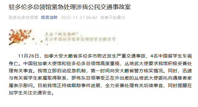香港新聞網11月27日電 據中國駐多倫多總領館微信公眾號“ 楓雪湖畔”消息,11月26日,加拿大安大略省多倫多市附近發生嚴重交通事故,4名中國留學生車禍身亡。中國駐加拿大使館和駐多倫多總領館高度重視,叢培武大使要求我館積極妥善處理有關事宜。我館立即啟動應急機制,第一時間向安大略省警方核實情況。同時,迅速與有關留學生家屬取得聯繫,羅偉東總領事受正在外出差的叢培武大使委托向遇難者家屬表示慰問。目前我館正持續跟蹤事件進展,全力妥善處理有關後續事宜,同時提醒在加學生關注交通安全。
