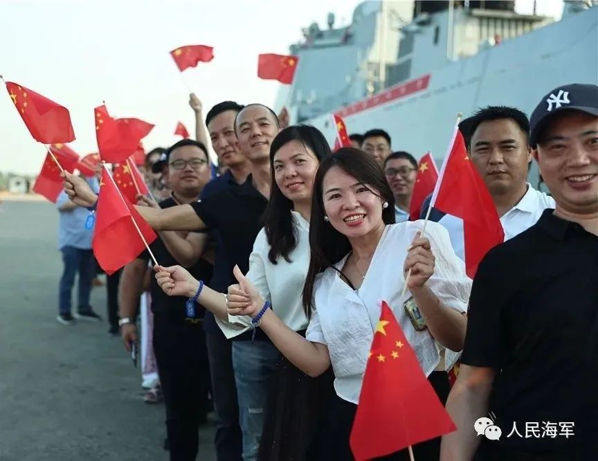 11月27日下午 , 海軍第44批護航編隊訪問緬甸仰光。圖為碼頭歡迎人群揮舞五星紅旗排隊參觀艦艇。方思航 攝 靠港後,陳海大使在淄博艦艦長、政委的陪同下檢閱了淄博艦儀仗隊並與編隊指揮員進行了座談交流。 緬甸海軍領導、我駐緬甸大使館工作人員以及前來歡迎的華人華僑登上淄博艦參觀。