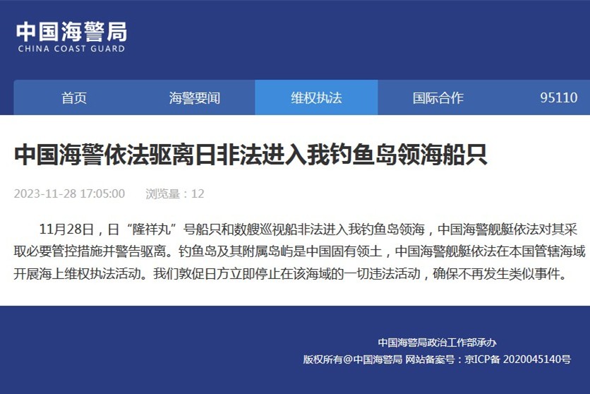 中國海警驅離日本非法進入釣魚島領海船隻。(中國海警局網頁截圖) 中國海警局表示,釣魚島及其附屬島嶼是中國固有領土,中國海警艦艇依法在本國管轄海域開展海上維權執法活動。我們敦促日方立即停止在該海域的一切違法活動,確保不再發生類似事件。 這已是本月第二次發生類似事件。11月1日,中國海警局新聞發言人甘羽表示,當日,日“惠丸”“鶴丸”“第八泰生丸”3艘船隻和數艘巡視船非法進入中國釣魚島領海,中國海警艦艇依法採取必要管控措施。 同日,中國外交部發言人汪文斌表示,日本右翼船隻非法進入釣魚島領海,嚴重侵犯中國主權。中國海警船依法開展現場執法,是維護主權的正當舉措。日本有關方面應停止在釣魚島海域的侵權挑釁,避免局勢進一步複雜化。(完) 【編輯:丘志彬】