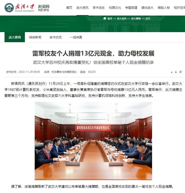 香港新聞網11月30日電 據武漢大學官網消息,29日上午,武漢大學1987級計算機系校友,小米集團創始人、董事長兼首席執行官雷軍向母校捐贈13億元人民幣。雷軍表示,此次捐贈主要聚焦三個方向:支持數理化文史哲六大學科基礎研究、支持計算機領域科技創新、支持大學生培養。 據了解,該筆捐贈刷新了武漢大學建校以來單筆最大捐贈額,也是全國高校收到的最大一筆校友個人現金捐贈。