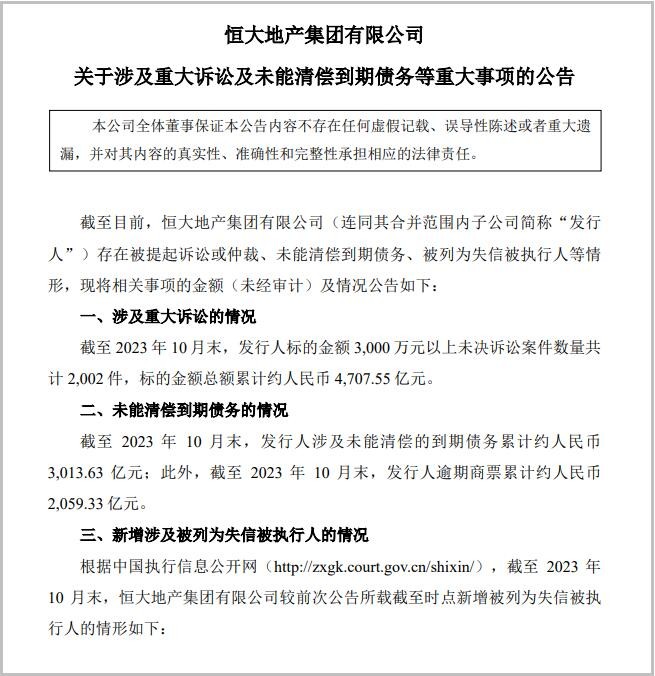 香港新聞網12月1日電 11月30日,恒大地產集團有限公司發佈公告稱,截至目前,恒大地產集團有限公司(連同其合並範圍內子公司簡稱“發行人”)存在被提起訴訟或仲裁、未能清償到期債務、被列為失信被執行人等情形,現將相關事項的金額(未經審計)及情況公告如下: 截至2023年10月末,發行人標的金額3000萬元以上未決訴訟案件數量共計2002件,標的金額總額累計約4707.55億元。截至2023年10月末,發行人涉及未能清償的到期債務累計約3013.63億元;此外,截至2023年10月末,發行人逾期商票累計約2059.33億元。(完)