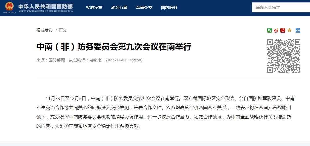 香港中通社12月3日電 據中國國防部12月3日消息,11月29日至12月3日,中南(非)防務委員會第九次會議在南舉行。雙方就國際地區安全形勢、各自國防和軍隊建設、中南軍事交流合作等共同關心的問題深入交換意見,簽署合作文件。