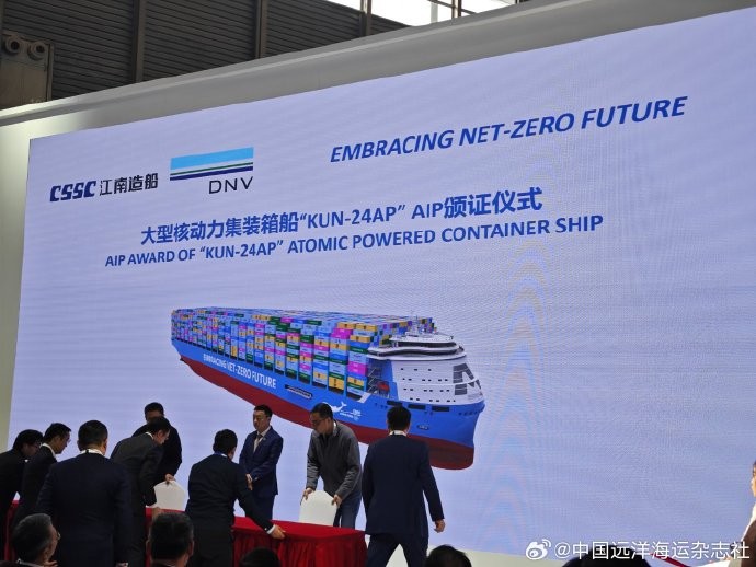 香港新聞網12月5日電 據@ 中國遠洋海運雜志社消息,12月5日,中國船舶集團有限公司旗下江南造船(集團)有限責任公司在2023年中國國際海事技術學術會和展覽會上正式發佈全球首型、世界最大24000TEU級核動力集裝箱船船型設計。這標志著江南造船在“近零排放”船型研發領域取得了革命性成果,並進一步拓展了該公司集裝箱船系列品牌。