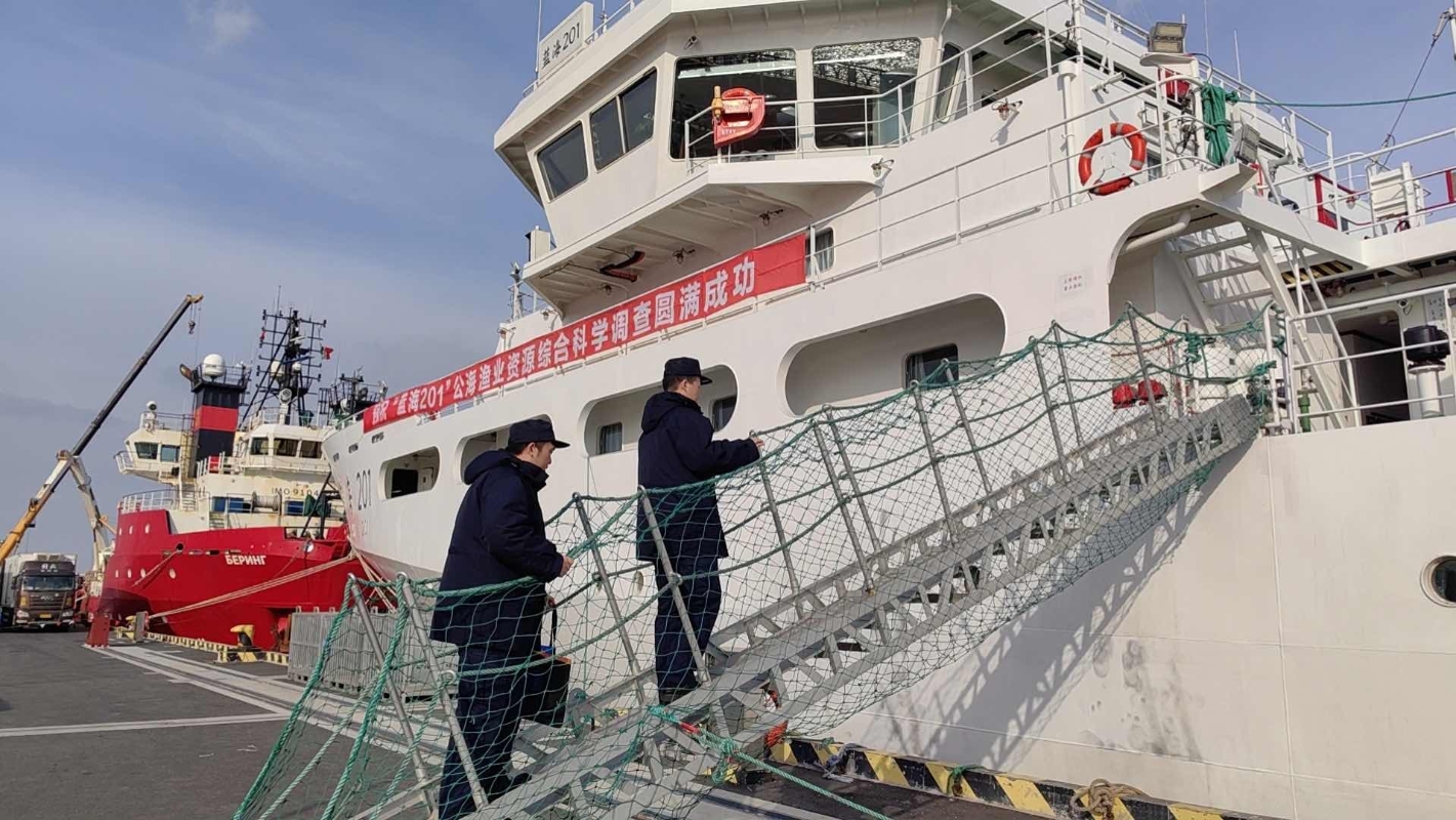 虹口海關對“藍海201”船供物料實施登臨檢查 王樹軍 攝 據澎湃新聞報道,“藍海201”號調查船隸屬於中國水產科學研究院東海水產研究所,為3000噸級漁業綜合科學調查船,由中國自主研發設計,具有全球航行能力(除兩極冰區以外)。“藍海201”號調查船是中國農業農村部迄今投資最多、噸位最大、設施最先進的漁業科學調查船,是中國海洋漁業科學研究的“國之重器”。 2019年6月交付以來,“藍海201”號調查船一直停靠在母港上海橫沙長興漁港碼頭,此次赴外執行漁業資源調查任務為該船首次出境。 “此次出海調查任務能助力我國遠洋漁業融入共建‘一帶一路’產業發展,提高我國參與國際漁業治理的話語權。由於是首次走出國門,我們對出航前的相關手續不是很了解。為確保此次調查任務的順利開展,我們第一時間向崇明海關咨詢、尋求幫助。”“藍海201”號調查船船長湯曉林說。
