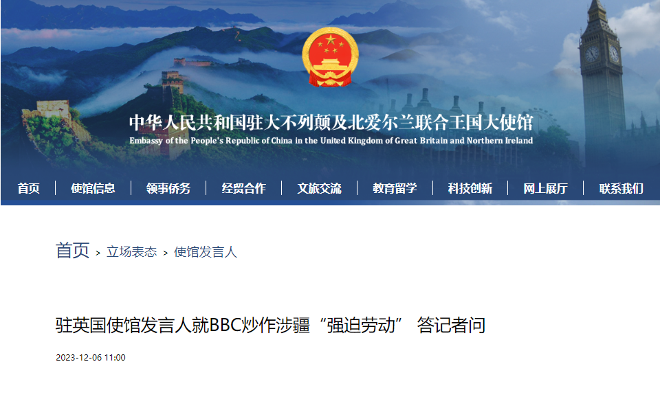 中國駐英國大使館網站截圖 記者:英國廣播公司(BBC)日前刊發報道稱,英國陸軍“普羅米修斯太陽能供電項目”涉嫌中國新疆“強迫勞動”。請問中國駐英使館有何評論? 使館發言人:上述報道妄稱中國新疆存在所謂“強迫勞動”,這是無中生有、惡意誹謗,我們對此堅決反對。 中國新疆地方政府在充分尊重各族群眾就業意願和需求基礎上,積極採取就近就業、疆內跨區就業等措施,幫助各族群眾實現就業、擺脫貧困,過上幸福生活,充分保障了各族群眾勞動就業權。新疆各族勞動者根據自己的意願選擇職業,本著平等自願原則與企業依法簽訂勞動合同,獲得相應報酬,不會因民族、性別、宗教信仰不同而受到任何歧視。 所謂新疆存在“強迫勞動”,純粹是一個“彌天大謊”。個別西方國家和反華勢力反復造謠惑眾,目的是要破壞新疆的穩定,遏制中國的發展。這種倒行逆施行徑不得人心,注定以失敗告終。 我們奉勸英國廣播公司恪守新聞職業道德和基本操守,秉持客觀、公正、專業的原則報道中國,停止為反華分子和謊言制造者提供炒作平台。(完) 【編輯:丘志彬】