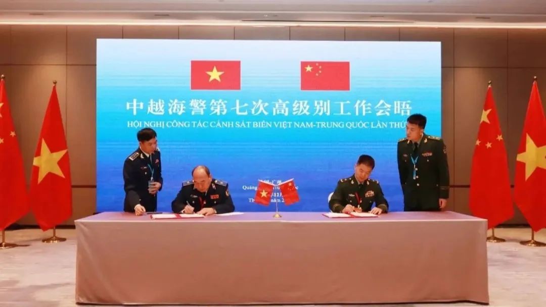 中越海警第七次高級別工作會晤現場 會上,雙方積極評價了年內合作成果,圍繞如何更好地領會、落實兩黨兩國領導人近期所達成的重要共識,以及對兩國海警加強海上執法合作有關指示要求進行了討論,決定建立政治工作交流機制、繼續挖掘北部灣海域聯合巡航合作潛力、打造“青年警官交流”合作品牌、開通海區級聯絡窗口、協同打擊海上違法犯罪,以進一步鞏固兩國傳統友誼、深化海上務實合作,穩妥處置海上突發事件、共同維護海上安全穩定。雙方還就共同關心的話題交換了意見。