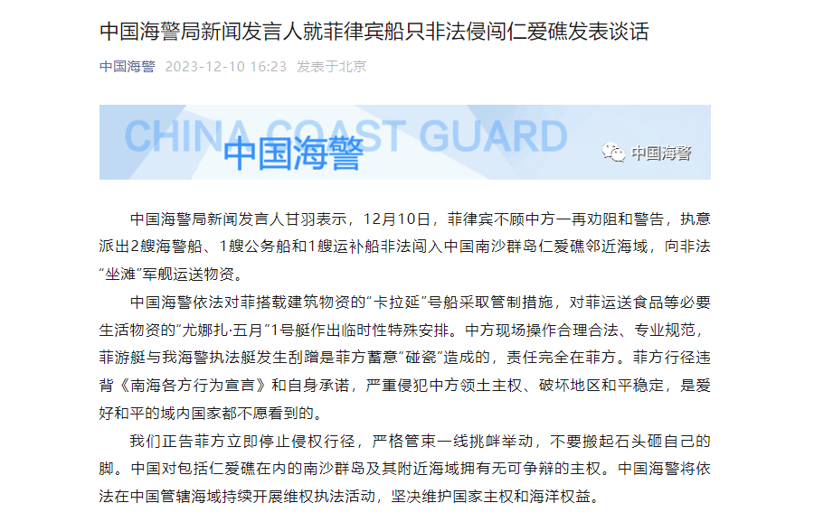 香港中通社12月10日電 “中國海警”微信公眾號10日消息,當日,菲律賓2艘海警船、1艘公務船和1艘運補船企圖向南海仁愛礁非法“坐灘”軍艦運送建築物資,嚴重侵犯中方主權,中國海警依法依規實施管制。