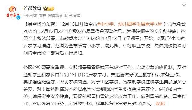 鄭州因暴雪臨時停課。(香港文匯網記者 劉蕊 攝) 12月11日,鄭州市教育局下發了關於極端惡劣天氣條件下臨時停課的通知。 根據氣象部門預報,鄭州市預計將會出現降雪、大風、低溫等惡劣天氣,將影響正常的教育教學活動,根據《鄭州市教育局關於低溫冰凍雨雪災害應急預案》,為保障師生的安全和健康,鄭州市教育局決定採取臨時停課措施。停課時間為2023年12月11日(周一)上午,停課範圍為全鄭州市(含區縣【市】)所有初中、小學和幼兒園學生。11日下午是否繼續停課,鄭州市教育局將根據天氣情況另行通知。 鄭州市教育局要求,各學校要通過各種方式立即通知到全體家長,並指導學生和家長做好防雨雪災害、預防傳染性疾病等相關準備;各高中和寄宿制學校要做好在校學生的安全管理,為學生提供充分的學習生活物資;各學校要開展除雪除冰工作,並組織對體育館、教學樓、宿舍、餐廳、廁所等重點區域進行安全排查,確保不留安全死角。同時各區縣(市)教育局和各學校要保障24小時領導帶班和人員值班制度,確保信息暢通。 新鄉市也發出通知表示,根據氣象部門預報,全市預計將會出現降雪、大風、低溫等惡劣天氣,將影響正常的教育教學活動,根據《新鄉市教育局關於低溫冰凍雨雪災害應急預案》,為保障師生的安全和健康,市教育局決定採取臨時停課措施。(完) 【編輯:丘志彬】