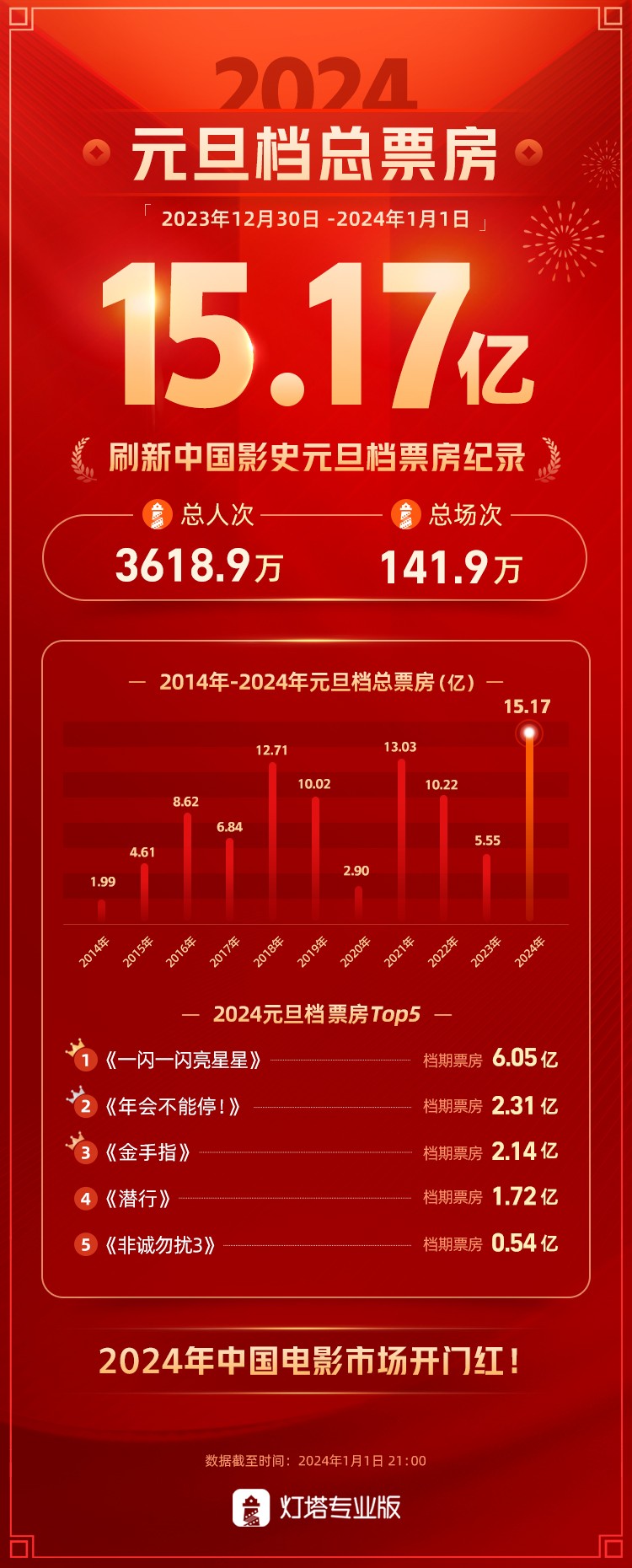 據燈塔專業版數據,截至1月1日21時,2024年元旦檔(2023年12月30日-2024年1月1日)檔期票房達15.17億元,刷新中國影史元旦檔票房紀錄,《一閃一閃亮星星》《年會不能停!》《金手指》《潛行》《非誠勿擾3》位列檔期票房榜前五位。來自貓眼專業版的數據也顯示,2024年元旦檔創下中國影史元旦檔票房新高,總觀影人次3616.4萬,總場次140.2萬,創中國影史元旦檔總場次新高。(完) 【編輯:丘志彬】