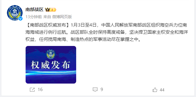 香港中通社1月3日電 中國南部戰區3日晚發布公告,3日至4日,中國人民解放軍南部戰區組織海空兵力位南海海域進行例行巡航。戰區部隊全時保持高度戒備,堅決捍衛國家主權安全和海洋權益,任何攪局南海、製造熱點的軍事活動盡在掌握之中。