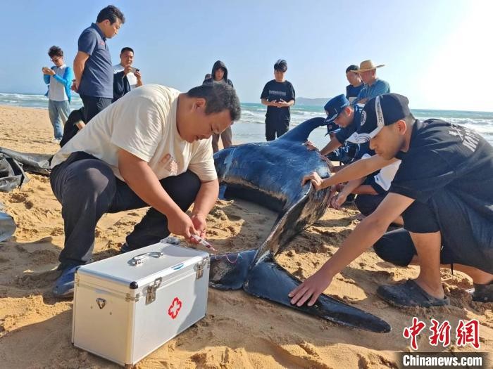 香港新聞網1月4日電 據三亞海昌生物保育中心3日消息,一受傷鯨魚當日在三亞海棠灣海灘擱淺,目前鯨魚已得到救助,救援人員將24小時輪流看護。