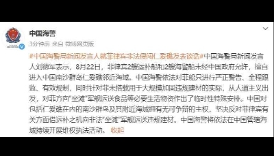 ▲ 2023年10月,菲律賓海警船有預謀主動倒車,尾部與中國停車漂泊的瓊三沙漁00003船右舷發生擦碰。 所謂的“中方對菲方船隻採取‘危險動作’”,實則是在警告非法闖入無果後,中方海警船選擇採取水炮噴射的低烈度措施進行驅逐,且水炮噴向附近海面,根本就沒有對準菲律賓船隻。 至於中方使用所謂“聲波”和“激光”武器,更是無中生有。中方既沒有意圖,也沒有必要使用類似裝置。 因果倒置、移花接木乃至直接造謠,這些都是典型的認知戰手法。 四問:是誰一再歪曲國際法? 2013年,菲律賓在美國慫恿支持下,提起了臭名昭著的南海仲裁案。2016年,南海仲裁案仲裁庭在美國等西方勢力的政治操弄下做出錯誤百出的所謂裁決。此後,菲律賓部分頑固親美反華勢力妄圖以此為依據,主張仁愛礁位於菲律賓的專屬經濟區。 眾所周知,南海仲裁案直接涉及領土主權和海洋劃界問題,領土問題不屬於《聯合國海洋法公約》的調整範圍,並且中國政府早已聲明排除《公約》強制爭端解決程序對海洋劃界等問題適用的事實。 菲律賓單方面提起的南海仲裁案顯然違反了“國家同意”原則,違反了包括《公約》在內的國際法的規定,完全是非法行為。在美西方操縱下成立的仲裁庭是一個毫無公信力的“草台班子”,越權管轄、枉法裁判,所作裁決自然是非法的、無效的,沒有任何拘束力。