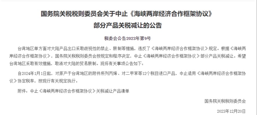 新華社資料圖片 商務部新聞發言人就中止《海峽兩岸經濟合作框架協議》(ECFA)部分產品關稅減讓的相關進展答記者問時表示,根據國務院關稅稅則委員會2023年12月21日公告,自2024年1月1日起,大陸方面已對原產於台灣地區的丙烯、對二甲苯等12個稅目進口產品,中止適用《海峽兩岸經濟合作框架協議》(ECFA)協定稅率,按現行有關規定執行。自公告發佈以來,民進黨當局未採取任何有效措施,取消對大陸的貿易限制,反而搞政治操弄,企圖栽贓甩鍋、迴避責任。目前,有關部門正依據ECFA相關條款和有關政策法規,研究進一步採取中止ECFA早期收穫農漁、機械、汽車零配件、紡織等產品關稅減讓等措施。(完) 【編輯:李雪萍】