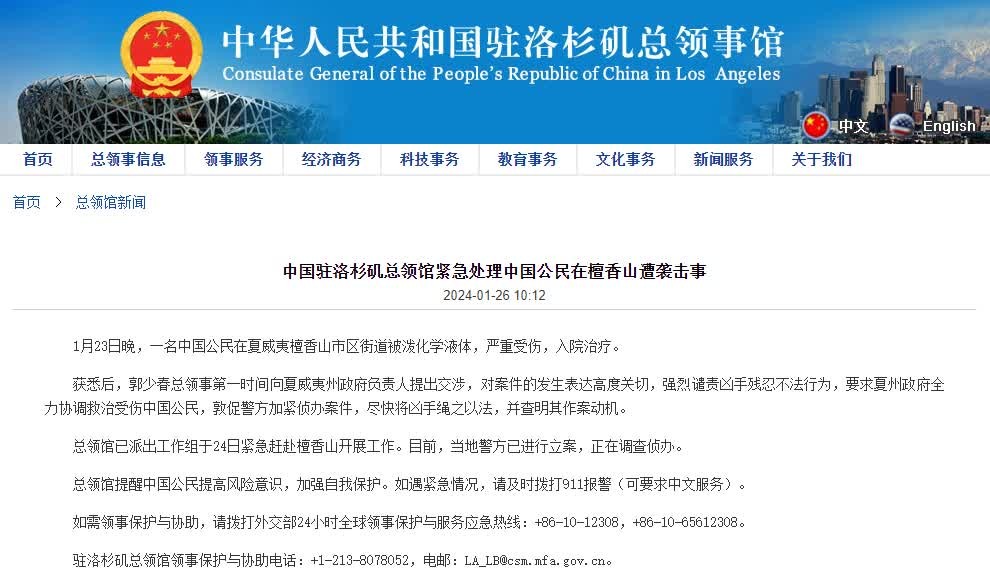 中國駐洛杉磯總領事館網站截圖 中國駐洛杉磯總領事館獲悉後,郭少春總領事第一時間向夏威夷州政府負責人提出交涉,對案件的發生表達高度關切,強烈譴責兇手殘忍不法行為,要求夏州政府全力協調救治受傷中國公民,敦促警方加緊偵辦案件,盡快將兇手繩之以法,並查明其作案動機。 總領館已派出工作組於24日緊急趕赴檀香山開展工作。目前,當地警方已進行立案,正在調查偵辦。(完) 【編輯:丘志彬】