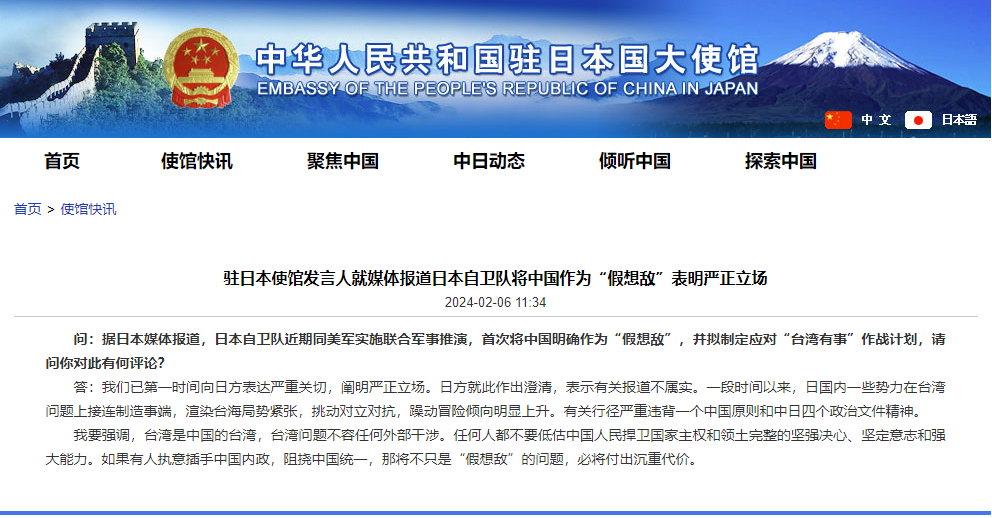 香港新聞網2月6日電 據日本媒體報道,日本自衛隊近期同美軍實施聯合軍事推演,首次將中國明確作為“假想敵”,並擬制定應對“台灣有事”作戰計劃。對此,中國駐日本使館發言人6日表示,我們已第一時間向日方表達嚴重關切,闡明嚴正立場。日方就此作出澄清,表示有關報道不屬實。一段時間以來,日國內一些勢力在台灣問題上接連製造事端,渲染台海局勢緊張,挑動對立對抗,躁動冒險傾向明顯上升。有關行徑嚴重違背一個中國原則和中日四個政治文件精神。 發言人表示,我要強調,台灣是中國的台灣,台灣問題不容任何外部干涉。任何人都不要低估中國人民捍衛國家主權和領土完整的堅強決心、堅定意志和強大能力。如果有人執意插手中國內政,阻撓中國統一,那將不只是“假想敵”的問題,必將付出沉重代價。(完)