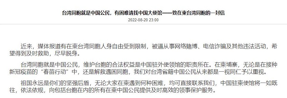 香港新聞網2月20日電 據微信公眾號“中國駐柬埔寨大使館”2月19日消息,近日,兩名中國台灣網紅在柬埔寨拍攝了損害柬國家形象的造假視頻,柬法院已依法對二人進行判決。事發後,柬西哈努克省政府及時向中國駐柬埔寨大使館駐西哈努克領事辦公室通報有關情況,中國駐柬埔寨大使館要求柬方在保障當事人合法權益的前提下依法依規處理。 中國駐柬埔寨大使館提醒在柬中國同胞務必遵守當地法律法規、尊重當地的風俗習慣,注意個人言行,切勿從事不法行為,互聯網不是法外之地。中國駐柬埔寨大使館在繼續維護包括台灣同胞在內廣大在柬同胞合法權益的同時,也絕不袒護在柬涉中國人的違法犯罪行為。