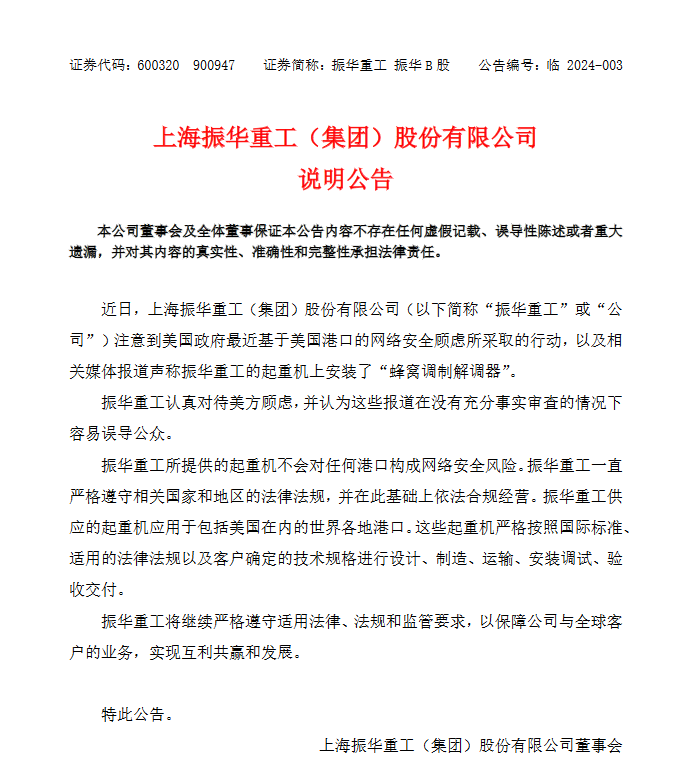 香港新聞網3月11日電 上海振華重工10日發佈公告回應“美國政府基於美國港口的網絡安全顧慮所採取的行動以及相關媒體報道”稱,振華重工所提供的起重機不會對任何港口構成網絡安全風險。 公告全文如下: 近日,上海振華重工(集團)股份有限公司(以下簡稱“振華重工”或“公司”)注意到美國政府最近基於美國港口的網絡安全顧慮所採取的行動,以及相關媒體報道聲稱振華重工的起重機上安裝了“蜂窩調制解調器”。 振華重工認真對待美方顧慮,并認為這些報道在沒有充分事實審查的情況下容易誤導公眾。 振華重工所提供的起重機不會對任何港口構成網絡安全風險。振華重工一直嚴格遵守相關國家和地區的法律法規,并在此基礎上依法合規經營。振華重工供應的起重機應用於包括美國在內的世界各地港口。這些起重機嚴格按照國際標準、適用的法律法規以及客戶確定的技術規格進行設計、製造、運輸、安裝調試、驗收交付。 振華重工將繼續嚴格遵守適用法律、法規和監管要求,以保障公司與全球客戶的業務,實現互利共贏和發展。 特此公告。 上海振華重工(集團)股份有限公司董事會