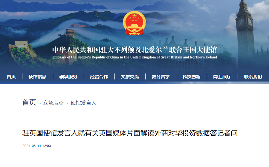 香港新聞網3月12日電 當地時間3月11日,中國駐英國使館發言人就有關英國媒體片面解讀外商對華投資數據答記者問。
