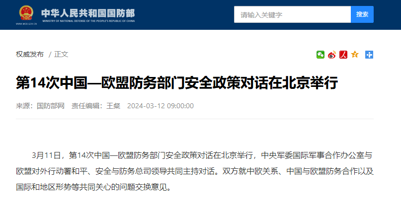 香港新聞網3月12日電 據中國國防部3月12日消息,3月11日,第14次中國—歐盟防務部門安全政策對話在北京舉行,中央軍委國際軍事合作辦公室與歐盟對外行動署和平、安全與防務總司領導共同主持對話。雙方就中歐關係、中國與歐盟防務合作以及國際和地區形勢等共同關心的問題交換意見。