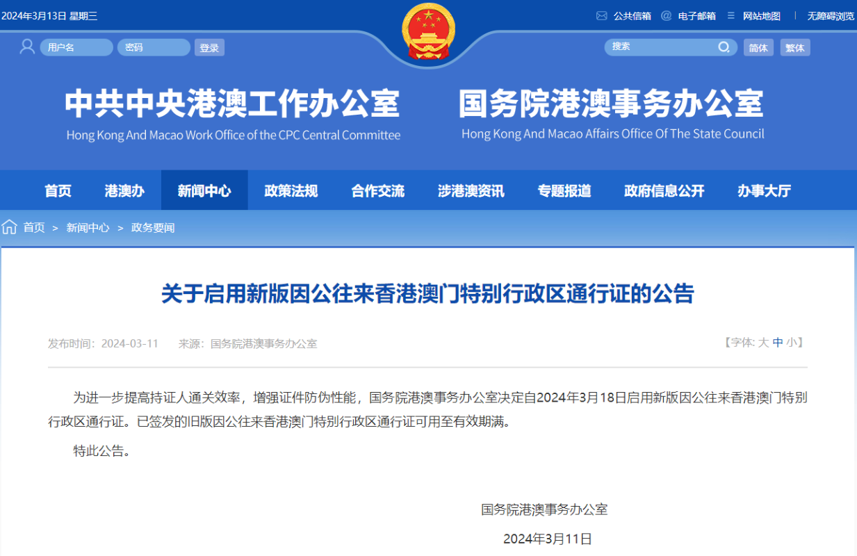 香港新聞網3月13日電 國務院港澳事務辦公室2024年3月11日發佈公告表示,為進一步提高持證人通關效率,增強證件防偽性能,國務院港澳事務辦公室決定自2024年3月18日啟用新版因公往來香港澳門特別行政區通行證。