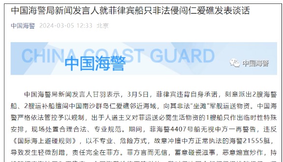 香港中通社3月15日電 中國國防部新聞局副局長、國防部新聞發言人張曉剛大校15日表示,日前菲方船隻未經中國政府允許,擅闖中國南沙群島仁愛礁鄰近海域,企圖向其非法“坐灘”軍艦運送包括建築材料在內的物資,期間還蓄意衝撞中國海警船,中國海警依法採取必要管制措施,現場操作專業克制、合理合法。中方對菲方侵權挑釁行徑表示強烈不滿、堅決反對。