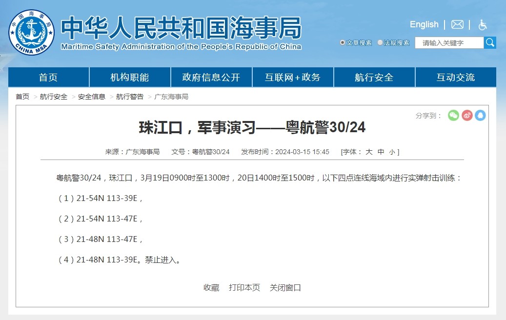 香港新聞網3月18日電 中國海事局網站消息,廣東海事局發佈航行警告,3月19日9時至13時,20日14時至15時,珠江口部分海域進行實彈射擊訓練,禁止進入。