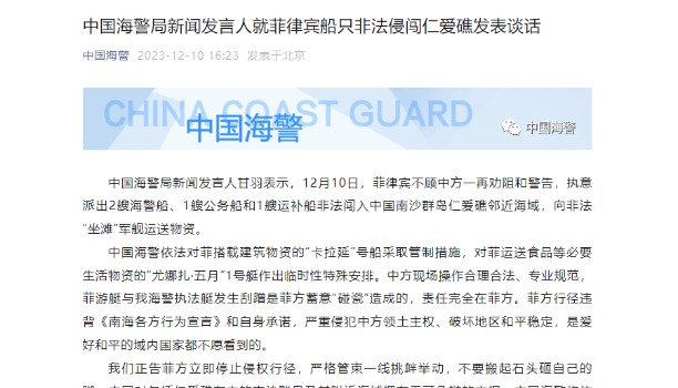 香港新聞網3月23日電 據中國海警局網站消息,中國海警局新聞發言人甘羽表示,3月23日,菲律賓在上輪運補僅18天之後,違背承諾,再次派出2艘海警船、1艘運補船擅闖中國仁愛礁鄰近海域,圖謀向其非法“坐灘”軍艦實施非正常運補,運送建築材料,借機侵權挑釁滋事,一意孤行蓄意破壞南海和平穩定。現場菲運補船不顧中方多次勸阻警告和航路管制,仍強行衝闖侵入。中國海警依法依規實施規制、攔阻、驅離,處置合理合法、專業規範。我們正告菲方:玩火者必自取其辱,中國海警全時嚴陣以待,堅決維護國家領土主權和海洋權益。