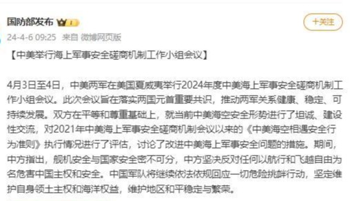 香港中通社4月6日電 4月3日至4日,中美兩軍在美國夏威夷舉行2024年度中美海上軍事安全磋商機制工作小組會議。此次會議旨在落實兩國元首重要共識,推動兩軍關係健康、穩定、可持續發展。