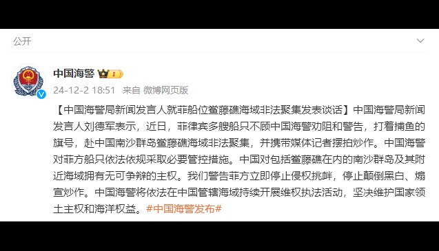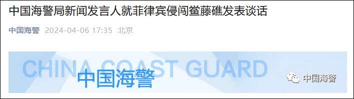 中國海警局新聞發言人就菲律賓侵闖鱟藤礁發表談話分享到: