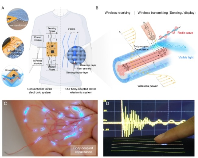 香港新聞網4月7日電 近日,東華大學校科研人員成功研發出集無綫能量採集、信息感知與傳輸等功能於一體的新型智能纖維,由其編織製成的紡織品無需依賴芯片和電池便可實現發光顯示、觸控等人機交互功能。 該成果近日發表於國際學術期刊《科學》,被認為有望改變人與環境以及人與人之間的交互方式,對功能性纖維開發以及智能紡織品在不同領域的應用具有重要啟發意義。 當前,智能可穿戴設備已成為日常生活的一部分,並在健康監測、遠程醫療、人機交互等領域發揮著重要作用。相較於傳統剛性半導體元件或柔性薄膜器件等,由智能纖維編織成的電子紡織品具有更好的透氣性和柔軟度,但目前智能纖維開發多基於“馮·諾依曼架構”,即以矽基芯片作為信息處理核心開發各種電子纖維功能模塊,如信號採集的傳感纖維、能量供應的發電纖維等,複雜的多模塊集成必然增大了紡織品的體積、重量和剛性。 東華大學材料科學與工程學院先進功能材料課題組在一次實驗中,偶然發現纖維在無綫電場中發出了光。以此為基礎,課題組開創性地提出“非馮·諾依曼架構”的新型智能纖維,實現了將能量採集、信息感知與傳輸等功能集成於單根纖維中。