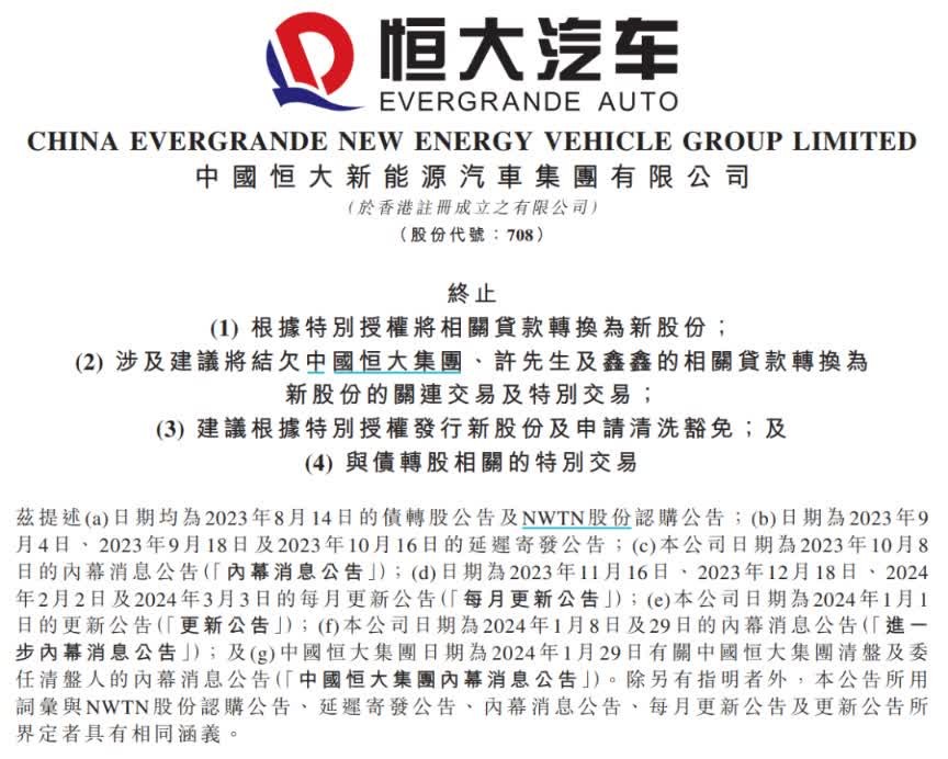 香港新聞網4月7日電 4月5日晚,恒大汽車發佈公告稱,紐頓集團戰略投資終止,公司此前擬議的交易及債轉股的條款修訂尚未取得任何進一步進展。據此前公告,紐頓集團的股份認購協議主要內容為,紐頓集團向恒大汽車實施戰略投資約5億美元,并提供6億元人民幣過渡資金;債轉股協議主要內容為,恒大集團、許家印等債權人通過認購恒大汽車新股份抵消恒大汽車結欠的208.95億港元債務。
