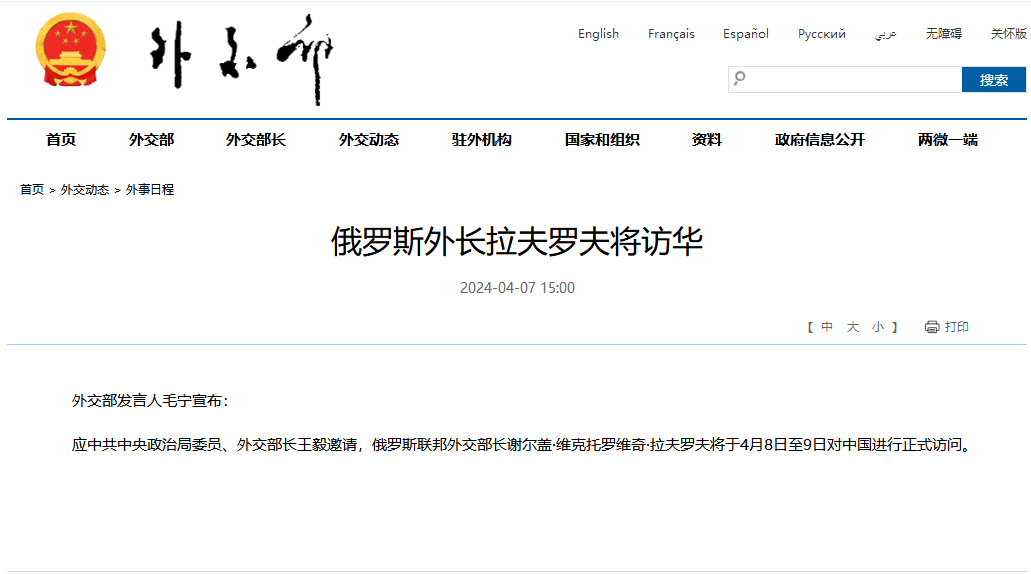 應中共中央政治局委員、外交部長王毅邀請,俄羅斯聯邦外交部長謝爾蓋·維克托羅維奇·拉夫羅夫將於4月8日至9日對中國進行正式訪問。