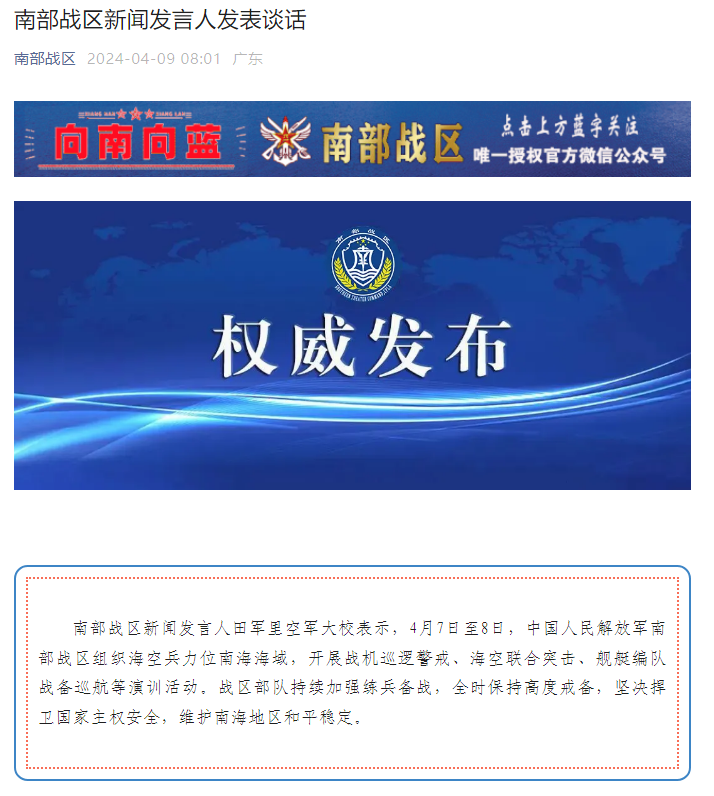 南部戰區新聞發言人田軍里空軍大校表示,4月7日至8日,中國人民解放軍南部戰區組織海空兵力位南海海域,開展戰機巡邏警戒、海空聯合突擊、艦艇編隊戰備巡航等演訓活動。戰區部隊持續加強練兵備戰,全時保持高度戒備,堅決捍衛國家主權安全,維護南海地區和平穩定。