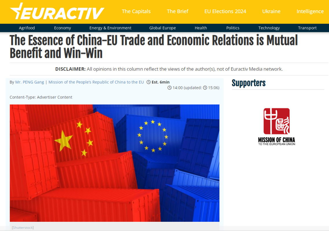 香港中通社4月9日電 中國駐歐盟使團經濟商務處公使彭剛當地時間8日在歐盟媒體“歐盟動態”發表署名文章,表示在歐盟將對華經貿合作視為“風險點”之際,中方反對將經濟問題政治化、意識形態化、泛安全化,使“去風險”變成“去機遇”和“去合作”。