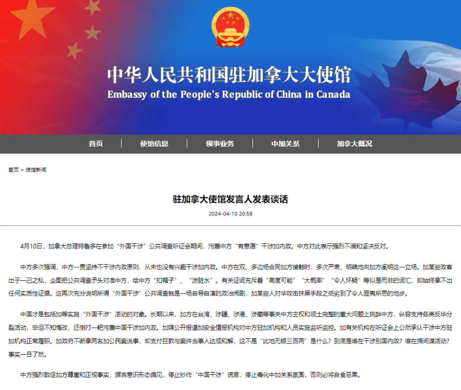 中國駐加拿大使館網站截圖 中方多次強調,中方一貫堅持不干涉內政原則,從未也沒有興趣干涉加內政。中方在雙、多邊場合同加方接觸時,多次嚴肅、明確地向加方闡明這一立場。加某些政客出於一己之私,企圖把公共調查矛頭對準中方,給中方“扣帽子”、“潑髒水”。有關證詞充斥着“高度可能”“大概率”“令人懷疑”等似是而非的詞彙,卻始終拿不出任何實質性證據。這再次充分說明所謂“外國干涉”公共調查就是一場自導自演的政治鬧劇,加某些人對華攻擊抹黑手段之低劣到了令人匪夷所思的地步。 中國才是包括加等實施“外國干涉”活動的對象。長期以來,加方在台灣、涉疆、涉港、涉藏等事關中方主權和領土完整的重大問題上挑釁中方,縱容支持各類反華分裂活動,非但不知悔改,還倒打一耙污衊中國干涉加內政。加媒公開報道加安全情報機構對中方駐加機構和人員實施監聽監控。加有關機構在聽證會上公然承認干涉中方駐加機構正常履職。加政府不斷拿兩名加公民案說事,卻支付巨款與案件當事人達成和解,這不是“此地無銀三百兩”是什麼?到底是誰在干涉別國內政?誰在搞間諜活動?事實一目了然。 中方強烈敦促加方尊重和正視事實,摒棄意識形態偏見,停止炒作“中國干涉”謊言,停止毒化中加關係氛圍,否則必將自食惡果。(完) 【編輯:丘志彬】