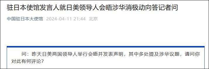 香港新聞網4月12日電 據微信公眾號“中國駐日本大使館”4月11日消息,中國駐日本使館發言人就日美領導人會晤涉華消極動向答記者問。