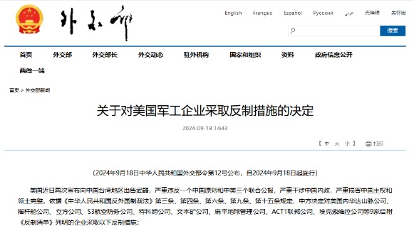 中國外交部指出,美國持續向中國台灣地區出售武器,嚴重違反一個中國原則和中美三個聯合公報規定,嚴重干涉中國內政,嚴重損害中國主權和領土完整。依據《中華人民共和國反外國制裁法》第三條、第四條、第五條、第六條、第九條、第十五條規定,中方決定對參與向中國台灣地區出售武器的美國通用原子航空系統公司、通用動力陸地系統公司採取反制措施。 反制措施包括:凍結在中國境內的動產、不動產和其他各類財產;對高級管理人員不予簽發簽證、不准入境。 該決定自4月11日起施行。(完) 【編輯:丘志彬】