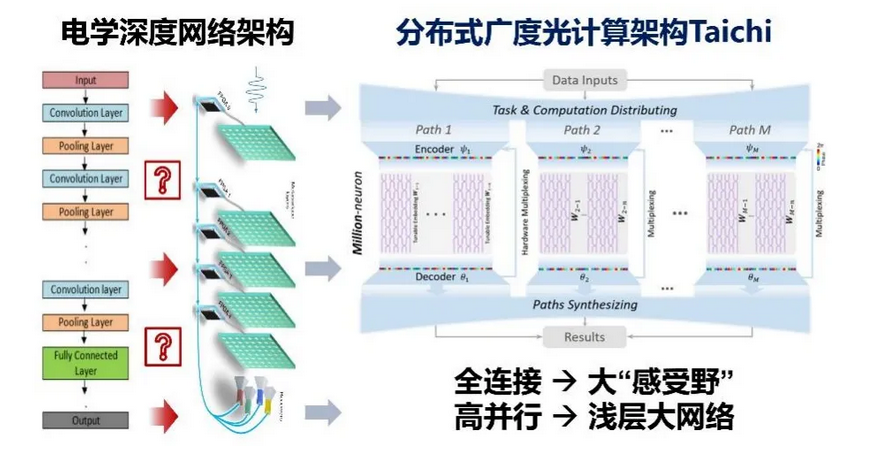 化“深”為“廣”:分布式廣度光計算架構。 智能光計算作為新興計算模態,在後摩爾時代展現出遠超矽基電子計算的性能與潛力。然而,其計算任務局限於簡單的字符分類、基本的圖像處理等。其痛點是光的計算優勢被困在不適合的電架構中,計算規模受限,無法支撐亟須高算力與高能效的複雜大模型智能計算。
