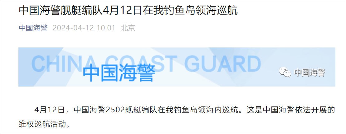 香港新聞網4月12日電 據中國海警微信公眾號消息,4月12日,中國海警2502艦艇編隊在我釣魚島領海內巡航。這是中國海警依法開展的維權巡航活動。