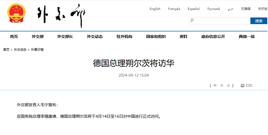 香港新聞網4月12日電 據中國外交部網站12日消息,外交部發言人毛寧宣布:應國務院總理李強邀請,德國總理朔爾茨將於4月14日至16日對中國進行正式訪問。