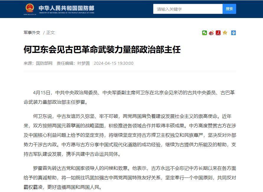 中國國防部網站截圖 據中國國防部當日消息,何衛東說,中古友誼歷久彌堅、牢不可破,兩黨兩國肩負著建設發展社會主義的崇高使命。近年來,雙方按照兩國元首擘畫的戰略藍圖,積極推進各領域合作並取得豐碩成果。中方高度讚賞古方在涉及中國核心利益問題上給予的堅定支持,將繼續堅定支持古方捍衛主權獨立和民族尊嚴,堅決反對外部勢力干涉古內政。中方願與古方分享中國式現代化道路的成功經驗,繼續為古提供力所能及的幫助,支持古軍隊建設發展,攜手共建中古命運共同體。 羅霍首先轉達古黨和國家領導人的問候和致意。他表示,古方永遠不會忘記中方長期以來在各方面給予的真誠幫助,將一如既往鞏固加強古中兩黨兩國特殊友好關係,堅定奉行一個中國原則,共同反對霸權霸凌,更好造福兩國和兩國人民。(完) 【編輯:丘志彬】