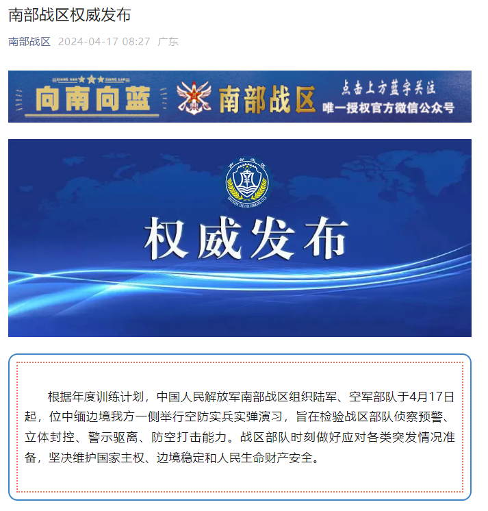 香港新聞網4月17日電 據中國人民解放軍南部戰區官方微信公眾號17日消息,根據年度訓練計劃,中國人民解放軍南部戰區組織陸軍、空軍部隊於4月17日起,位中緬邊境中方一側舉行空防實兵實彈演習,旨在檢驗戰區部隊偵察預警、立體封控、警示驅離、防空打擊能力。戰區部隊時刻做好應對各類突發情況準備,堅決維護國家主權、邊境穩定和人民生命財產安全。