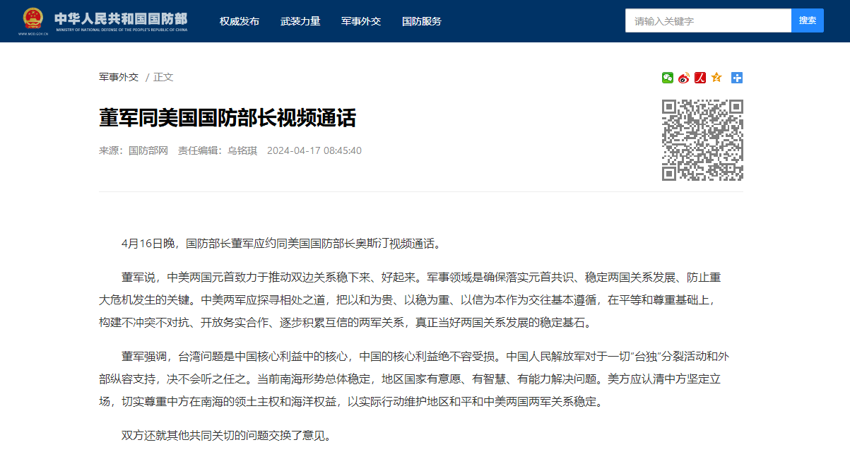 香港新聞網4月17日電 據中國國防部網站17日消息,4月16日晚,中國國防部長董軍應約同美國國防部長奧斯汀視頻通話。