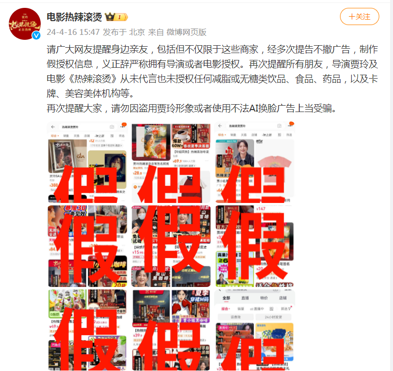 “電影熱辣滾燙”官方微博截圖 近日,“電影熱辣滾燙”官方微博發出了多張打假圖片,圖片中不乏賈玲同款《熱辣滾燙》短袖、賈玲同款減肥黑咖啡、《熱辣滾燙》同款沙拉等產品。 官方微博發文表示,導演賈玲及電影《熱辣滾燙》從未代言也未授權任何減脂或無糖類飲品、食品、藥品,以及卡牌、美容美體機構等,提醒網友不要上當受騙。 同時,賈玲公司@大碗娛樂轉發了該條微博。 4月3日,大碗娛樂曾發聲明稱:北京大碗娛樂文化傳媒有限公司現發現有不法商家未獲得藝人賈玲許可,擅自使用其肖像,謊稱藝人為其品牌及/或產品進行代言或開展合作,誤導公眾認為該品牌或產品與藝人存在合作關係。 針對上述情況,北京大碗娛樂文化傳媒有限公司鄭重聲明:任何未經官方渠道(我公司官微或藝人官方認證微博)宣稱之代言及合作均為虛假信息。(完) 【編輯:葉永成】