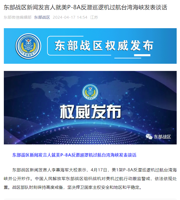 香港新聞網4月17日電 據“東部戰區”微信公眾號消息,中國人民解放軍東部戰區新聞發言人李熹海軍大校表示,4月17日,美1架P-8A反潛巡邏機過航台灣海峽并公開炒作。中國人民解放軍東部戰區組織戰機對美機過航行動跟監警戒,依法依規處置。戰區部隊時刻保持高度戒備,堅決捍衛國家主權安全和地區和平穩定。