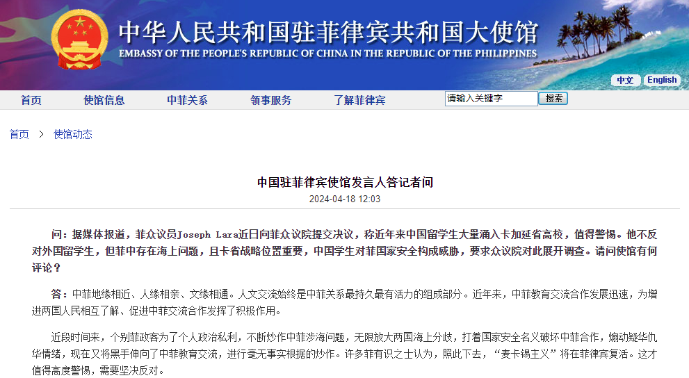 中國駐菲律賓大使館網站截圖 據媒體報道,菲眾議員Joseph Lara近日向菲眾議院提交決議,稱近年來中國留學生大量湧入卡加延省高校,值得警惕。他不反對外國留學生,但菲中存在海上問題,且卡省戰略位置重要,中國學生對菲國家安全構成威脅,要求眾議院對此展開調查。 中國駐菲律賓大使館18日在答問時就此表示,中菲地緣相近、人緣相親、文緣相通。人文交流始終是中菲關係最持久最有活力的組成部分。近年來,中菲教育交流合作發展迅速,為增進兩國人民相互了解、促進中菲交流合作發揮了積極作用。 中使館說,近段時間來,個別菲政客為了個人政治私利,不斷炒作中菲涉海問題,無限放大兩國海上分歧,打著國家安全名義破壞中菲合作,煽動疑華仇華情緒,現在又將黑手伸向了中菲教育交流,進行毫無事實根據的炒作。許多菲有識之士認為,照此下去,“麥卡錫主義”將在菲律賓復活。這才值得高度警惕,需要堅決反對。 另外,據報道,菲警方在14日的一場行動中逮捕一中國公民,查獲並沒收槍支等違禁品。菲警方表示,初步調查顯示,此案與網絡賭博有關。中國駐菲律賓大使館18日對此回應稱,中國政府一向反對任何形式的賭博,反對中國公民出境從事賭博業,要求中國公民在海外遵守當地法律法規。賭博是社會毒瘤,中國人民也是網絡賭博的受害者。中國駐菲使館將就離岸博彩業引發的犯罪問題與菲方執法機構繼續保持溝通,支持菲方盡早從根源上徹底解決離岸博彩業相關頑疾。(完) 【編輯:馬華】