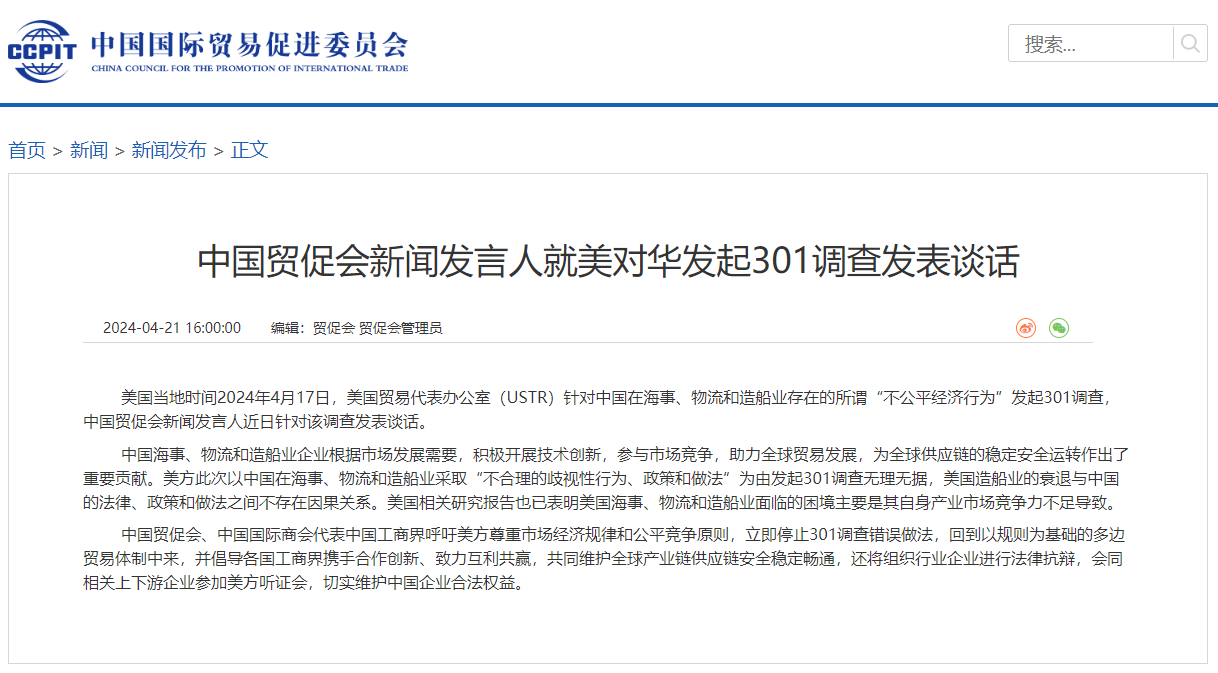 中國貿促會網站截圖 據中國貿促會21日消息,發言人表示,美國造船業的衰退與中國的法律、政策和做法之間不存在因果關係。中國貿促會、中國國際商會代表中國工商界呼籲美方尊重市場經濟規律和公平競爭原則,立即停止301調查錯誤做法,回到以規則為基礎的多邊貿易體制中來。 3月12日,美國五大工會向美國貿易代表辦公室提出申請,要求對中國在海事、物流和造船領域的行為、政策和做法進行調查。這些工會聲稱中國政府主導全球造船、海事和物流行業的努力是建立在非市場政策的基礎上。據報道,他們要求拜登政府對中國製造的船隻徵收港口費,並以此建立一個基金來振興美國造船業。 4月17日,美國貿易代表辦公室宣佈發起301調查。美國貿易代表戴琪透露,她預計關於對價值3000多億美元從中國進口商品加徵關稅的審查,“很快”就會得出結論,拜登政府一直在研究如何使相關措施更具戰略性和有效性。戴琪還聲稱“中國鋼鐵和鋁行業的產能過剩”對美國構成所謂威脅,需要強有力的回應。 中國外交部發言人林劍18日在記者會上表示,中方一貫要求美方切實尊重公平競爭原則,遵守世貿組織規則,立即停止針對中國的貿易保護主義措施。中方將採取一切必要措施維護自身的正當權利。(完) 【編輯:丘志彬】