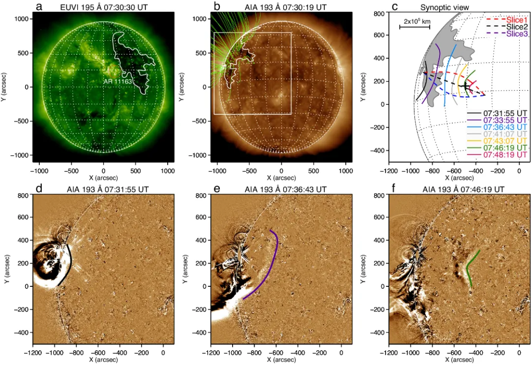 耀斑爆發(波源)、冕洞(凸透鏡)和磁流體力學波的波前擴散和聚焦過程。研究團隊供圖 袁丁團隊發現,太陽耀斑爆發觸發了大尺度的磁流體動力學波,波前以太陽耀斑為中心往四周擴散傳播,磁流體動力學波途經過一個巨大的冕洞。 據了解,日冕中溫度低、等離子體密度低、磁場強度低的區域,在空間太陽望遠鏡的極紫外波段輻射弱,所以稱為冕洞。“冕洞充當了‘凸透鏡’的角色,磁流體動力學波從由四周擴散變為向焦點逐漸聚焦。”袁丁介紹,據測量,該磁流體動力學波經過聚焦後,波動振幅增加3倍,所攜帶能量流提升7倍,這表明這種現象具備能量聚焦效應。 另悉,該研究將為國家重大科技基礎設施——“空間環境地面模擬裝置”提供理論依據和數值模型基礎。(完) 【編輯:丘志彬】