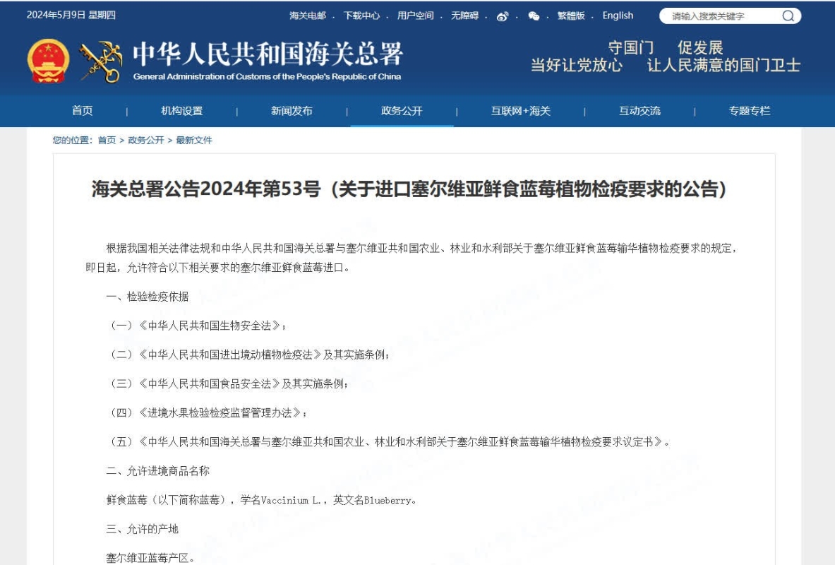 中國海關總署:允許符合相關要求的塞爾維亞鮮食藍莓進口